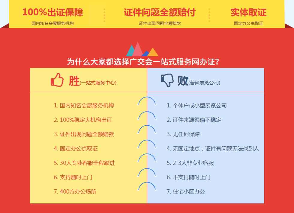 办理广交会证件流程① 浏览相关证件描述与参展须知 选择诚商会员办理的可直接与其联络 ② 咨询客服是否可以办理此类证件 ③ 确定参展时间及相关人员 ④ 通过即时聊天工具或邮箱传送身份证扫描件与办证人员照片 ⑤ 发送资料时留言备注参展姓名电话及参展时间 ⑥ 确认资料无误 付款之后我们将马上提交资料审核办理证件 ⑦ 审核通过后我们将以短信和电话方式通知您办理结果 ⑧ 取证地点:办公地址:海珠区新港东路245号 (地铁8号线磨碟沙B出口琶洲展馆方向300米):公交园艺站 下车即可 或中国进出口商品交易会 广交会琶洲会馆C区11号门取证。 客户须知1. 由于广交会证件具有时效性 自上交资料后即视为已提交 半小时后不接受退换 2. 我们承诺证件100%真实有效 可选择担保交易 无效退款并赔偿损失 承诺假一赔万 3. 证件办理需要时间 我们可以保证不影响您的参展 出证后 我们会以短信或者电话及时通知您 4. 若不方便取证 可以快递给您 证件办理付款后 我们会在当日发货 相关快递费用由您自行承担 5. 对会员的服务态度及投诉建议可随时联络我们 我们会对其做相应处理并在网上公布 办理证件需要提供的资料1. 二代身份证原件正.反面电子版(可用扫描,相机,手机拍照,需注意清晰平面)。如图